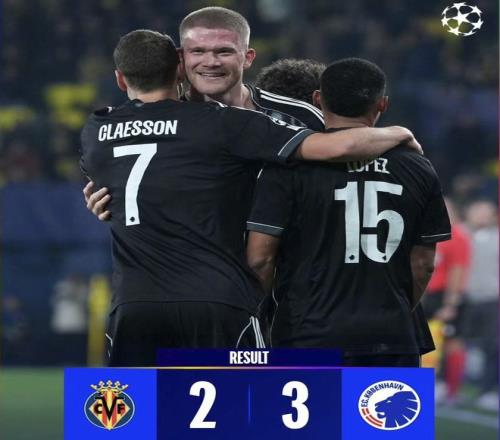开场2分钟哥本哈根前锋埃尔尤努西攻破了比利亚雷亚尔的球门,下半场科梅萨尼亚为比利亚雷亚尔扳平比分,阿舒里的进球帮助哥本哈根再次领先,奥卢瓦塞伊的进球为比利亚雷亚尔追至2-2。第90分钟,科内柳斯禁区内推射得手,黄色潜水艇2-3被绝杀。在本赛季欧冠中,比利亚雷亚尔除了战平尤文以外,其余5场比赛面对热刺、曼城、塞浦路斯的帕福斯、多特以及哥本哈根全败,最近4连败,目前与哈萨克斯坦的球队阿拉木图凯拉特同为1分,排名欧冠36强积分榜倒数第2位。